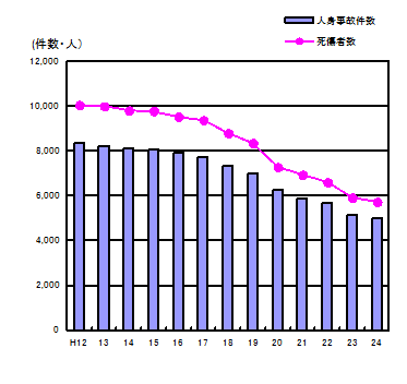 ≪公安≫ 平成24年中における県内の交通人身事故は,発生件数4,973件、死者数47人、負傷者数5,667人であり、発生件数及び負傷者数は12年連続で減少し、死者数については3年連続で減少し昭和27年以来の40人台となった。